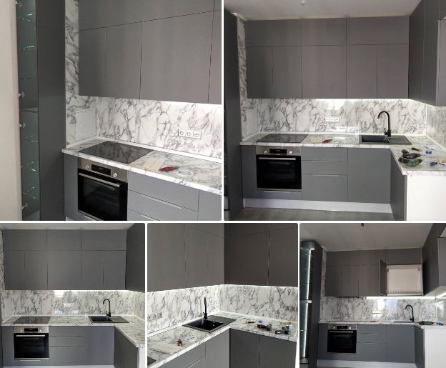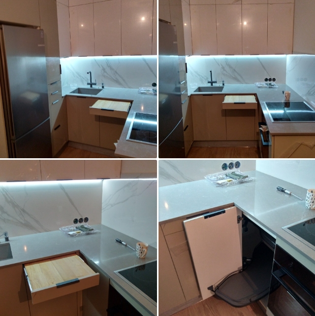 Мастер устанавливал столешницу, делал вырезы в ней, навешивал дверцы и шкафы кухонного гарнитура. Пришёл минута в минуту, как и договаривались, чистый и опрятный, с инструментом, в общении приятный.